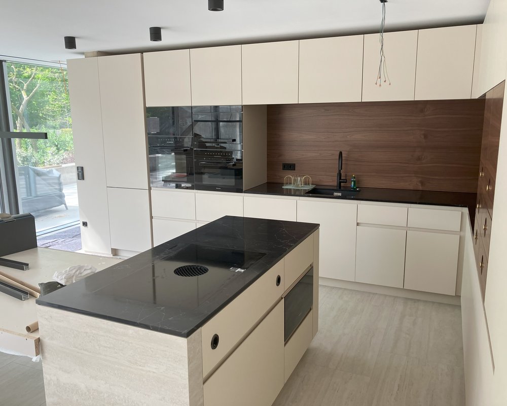 - Kochinsel mit exklusiver Verkleidung aus Porzellankeramik an Arbeitsplatte und Fronten