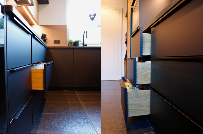 - Hochwertige Massivholzschubkästen in Eiche, klassisch handwerklich fingergezinkt