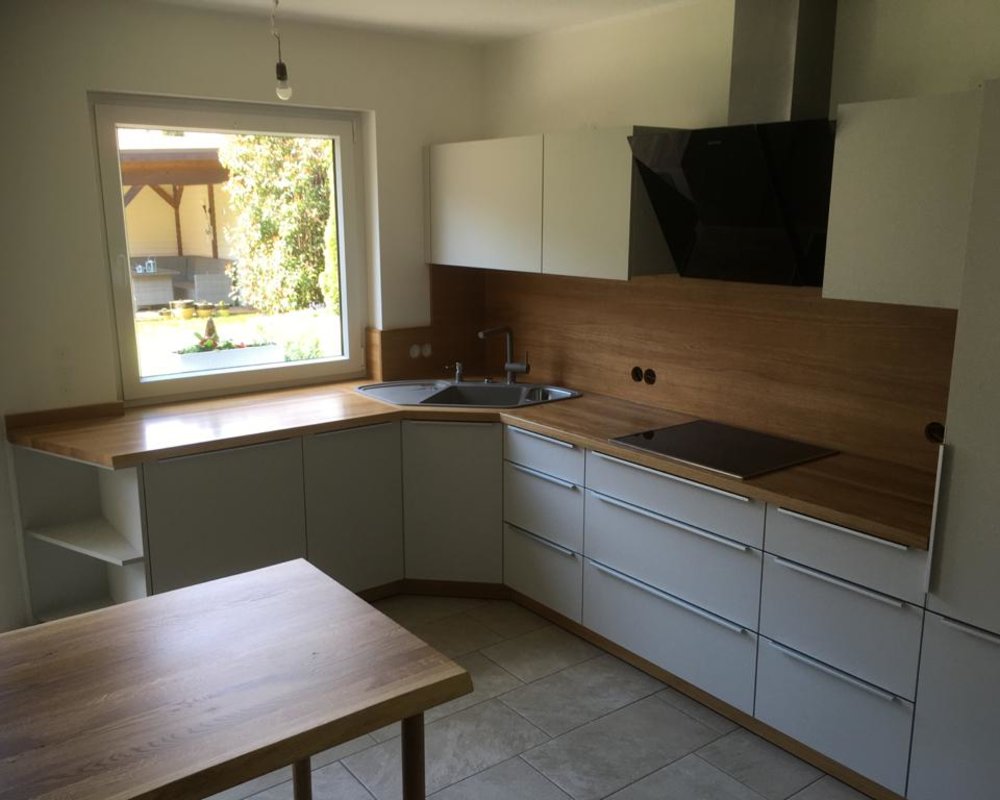 - Küchenrückwand in Weiß-Hochglanz mit eleganter, umlaufender Griffmulde